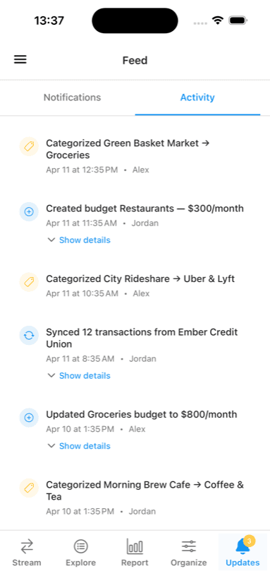 Jordan and Alex share financial management equally. Both are Owners in their shared workspace. Jordan handles the auto-rules for recurring bills and insurance. Alex manages the grocery and dining budgets. Both can see everything the other does in the activity feed. When Alex recategorizes a transaction Jordan entered, Jordan sees it logged and can ask about it, or just trust the change.