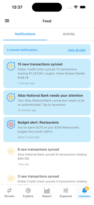 Jordan manages the household budget. They connect the joint checking account and two credit cards to a shared workspace, set up categories, and create monthly budgets. Their partner Alex is added as a Viewer. Alex can open the app anytime to see spending against budget, review recent transactions, and look at cash flow reports, but cannot accidentally change a category or delete a transaction. If they decide Alex should start helping with categorization, Jordan promotes Alex to Member in one tap.