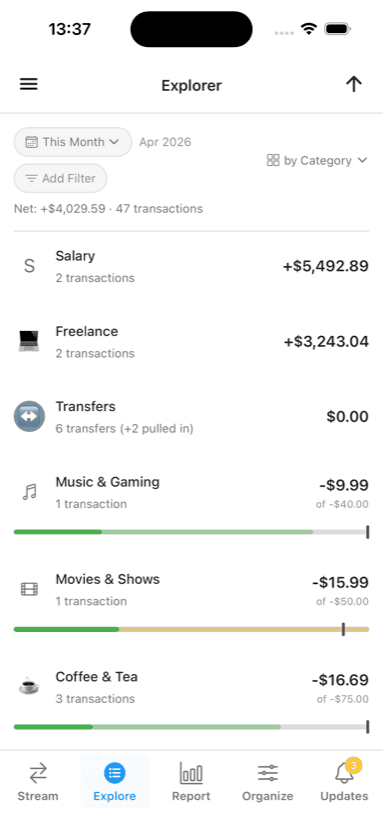 Copilot has a polished interface and good transaction categorization, but it does not support sharing at all. If you are a couple, one of you can use it and the other cannot see anything. That is a dealbreaker for joint budgeting.