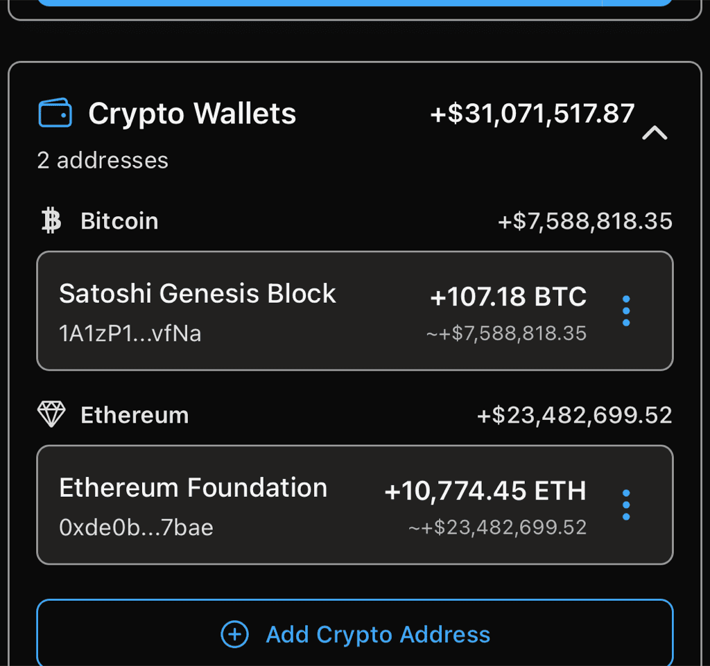 From the Accounts screen, tap the + button and select Track Crypto Wallet.