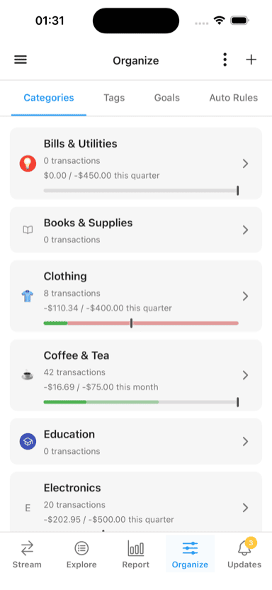 - Categories - Organize transactions for budgeting