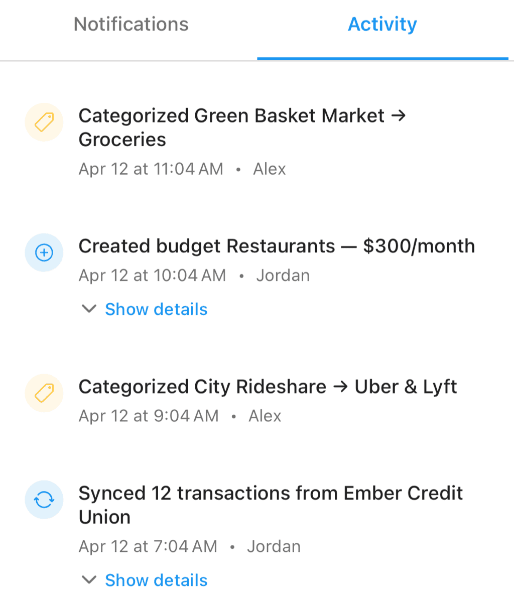 The activity log records actions taken in your workspace, showing who made changes, what was changed, and when. It's your audit trail for shared financial management.