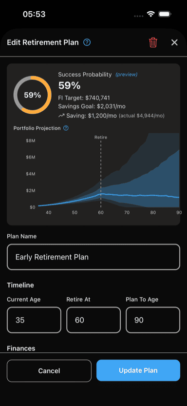 Your plan's inputs change over time — salary increases, spending habits shift, market conditions evolve. Revisit your plan at least once a year and update your current savings and spending.